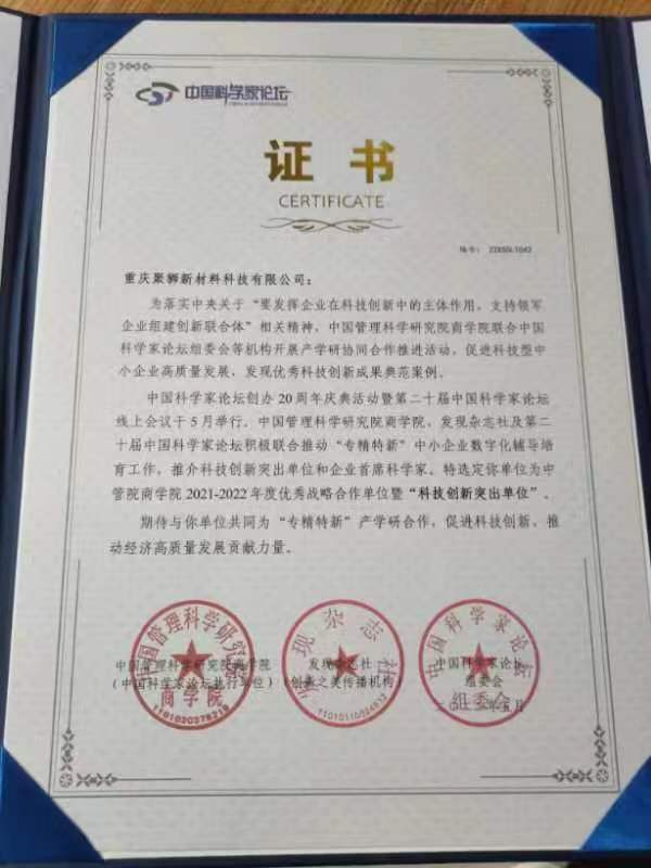 論壇組委會對重慶聚獅新材料科技有限公司(以下簡稱“聚獅新材料”)在技術研發領域敢于探索、勇于創新,在推動科技自強自立、行業發展、技術創新方面做出的突出貢獻表示肯定和欣賞,選定聚獅新材料為中國管理科學研究院商學院2021-2022年度優秀戰略合作單位暨“科技創新突出單位”,并授予聚獅新材料的“一種聚苯硫醚生產中濾液組分分離前處理方法及系統”專利 “科技創新優秀發明成果”。